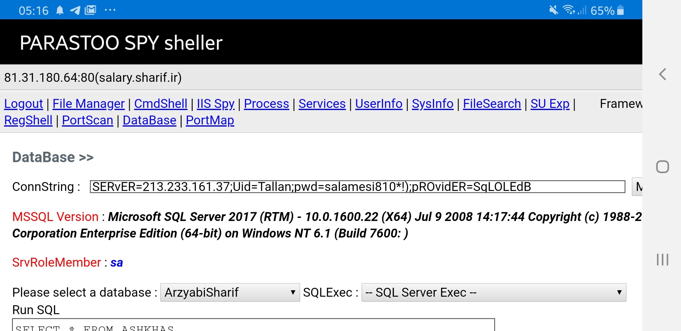 Framework Ver : 2.0.50727.3603 Logout | File Manager | CmdShell | IIS Spy | Process | Services | UserInfo | SysInfo | FileSearch | SU Exp | RegShell | PortScan | DataBase | PortMapDataBase >>ConnString : MSSQL ACCESS