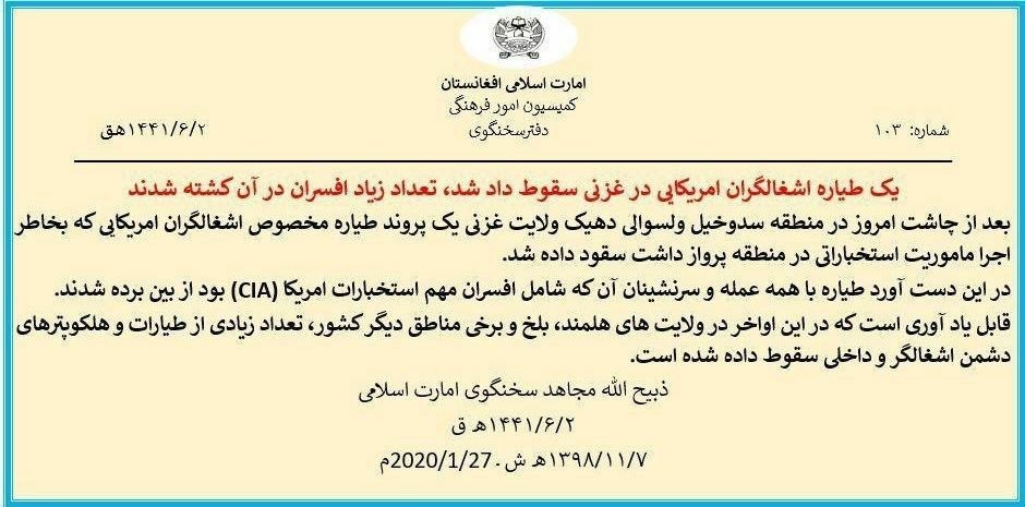 Beyond preliminary information and rumors following the crash of the E-11A aircraft belonging to # 9358/11 US Air Force killing #Michael D’Andrea, (and Daniel Mike Adams) known as the US military’s most prominent intelligence officer in the design of the Osama bin Laden Discovery Operation (Head of CIA Iran Ops), we can now confirm that no evidence of the aircraft being destroyed by a missile or defense system has yet been reached and that it looks unlikely. We can also say that the technology or equipment and knowledge required to carry out these operations is more than the logistical and technological capability of this militant group, contrary to the #Taliban’s claim of responsibility. It is worth noting that the geographic area of the plane crashed is in relatively lowland areas with few lowlands and elevations.
