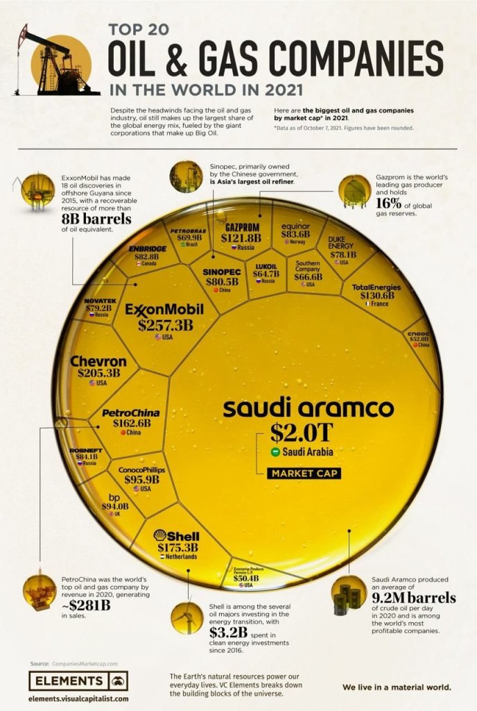 The map shows the 20 largest oil and gas companies in the world in 2021. Iran, despite having the third largest oil reserves and the second largest gas reserves in the world, is not among the 20 largest oil companies due to sanctions, worn-out infrastructure, export inability and domestic inefficiency. The world’s top oil companies are currently as follows: