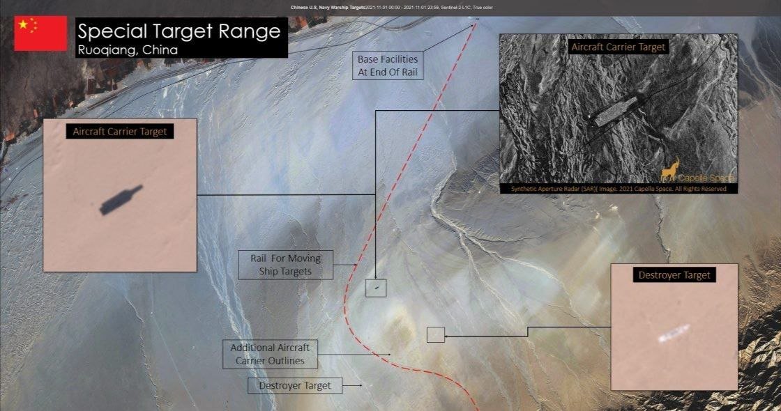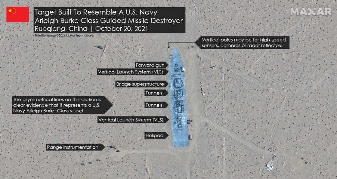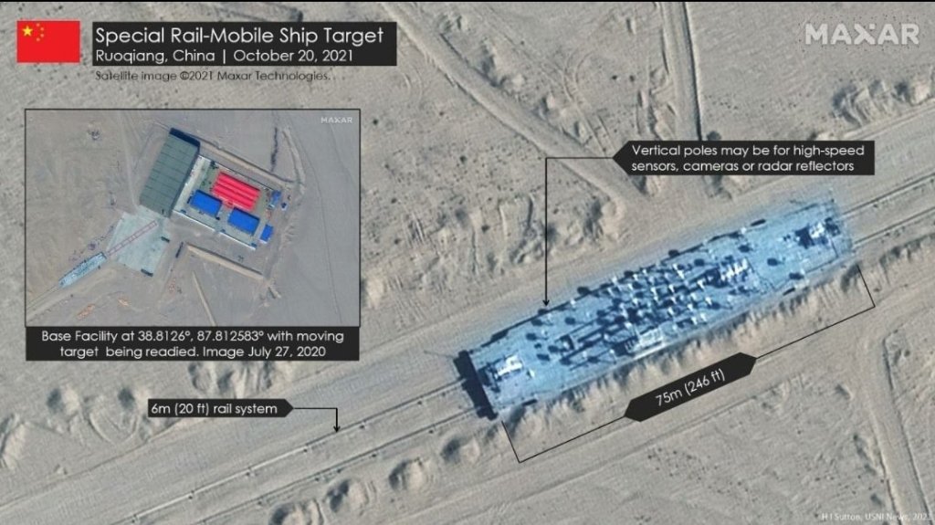 It became known that in the area of the Charklyk / Zhoqiang missile range (Taklamakan Desert, Xinjiang Uygur Autonomous Region), China has built targets for destruction – an American aircraft carrier and two Orly Burke-class destroyers. Construction began in 2019. An extensive railroad has been laid up to the landfill, along which targets can move. Photo 3 shows a target on a railway platform (dimensions: length – 75 m, width – 6 m).