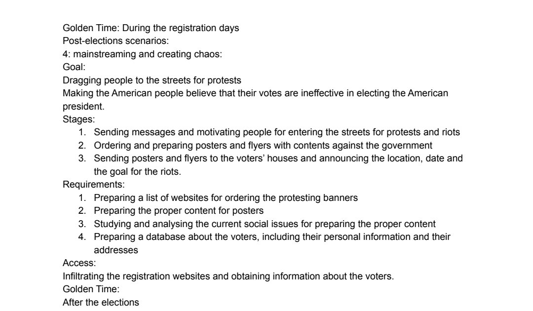 This document clearly states the different scenarios, the objectives of each scenario, the phases, the access to the systems, and the golden time of carrying out these terrorist activities. If you read this document carefully, these scenarios are divided into “pre-election” and “post-election” categories, each with separate terrorist goals.