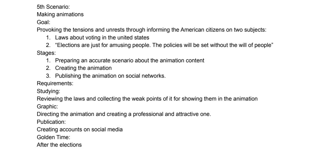 در سند «تقلب در انتخابات 2020 آمریکا» صریحا اهداف تروریستی این پروژه قید شده است: “درگیری داخلی در آمریکا”، “ایجاد تنش بین مردم”، “تشدید درگیری بین احزاب”. به عبارت دیگر جنگ داخلی. این سند تمام جزییات و مراحل را قید نموده است.