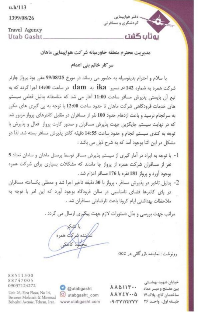 Greetings and best regards, on this date, on 08/25/99, the charter flight of Hamrah Company No. 142 on the ika route to Dam was scheduled to be operated at 14:00, as a result of which the passenger reception must begin at 11:00. Unfortunately, due to the outage of Mahan’s airport service systems, it did not end until about 12:00 due to repeated follow-ups, causing about 100 passengers to be evacuated in front of the mentioned flight counters, which eventually became an alternative system for accepting passengers and Issuance of active flight card and reception was done due to the slowness of the system and the passenger reception counter was closed at about 14:55. Therefore, two problems arose in the meantime, which are as follows: