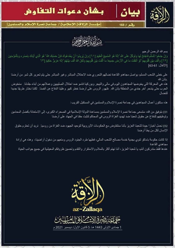01) With the help of God, Jama’a Nusrat al-Islam and Muslims, with the help of the Islamic State in the Great Sahara, will seek the assistance of the best lawyers and employ them to defend the rights of our people against the threat of the Russian invaders in the courts to prove our right to jihad on our land
