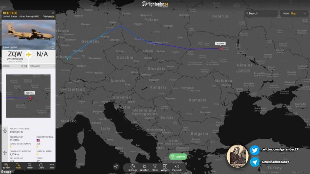 US Air Force Boeing E-8C Joint STARS combat control and targeting aircraft, board 01-2005, from Ramstein airbase, is currently heading to the Boeing RC-135V 63-9792 operation area.