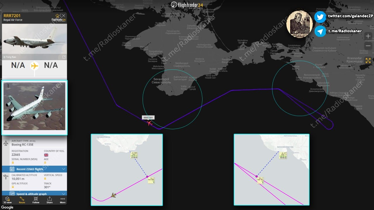 The Royal Air Force’s electronic reconnaissance aircraft Boeing RC-135W Airseeker R.1, board ZZ665 performs a reconnaissance mission from the Mildenhall airbase in the Black Sea along the Crimean coast. The minimum distance in the Sevastopol region was 46 km, in the Novorossiysk region, 47 km.