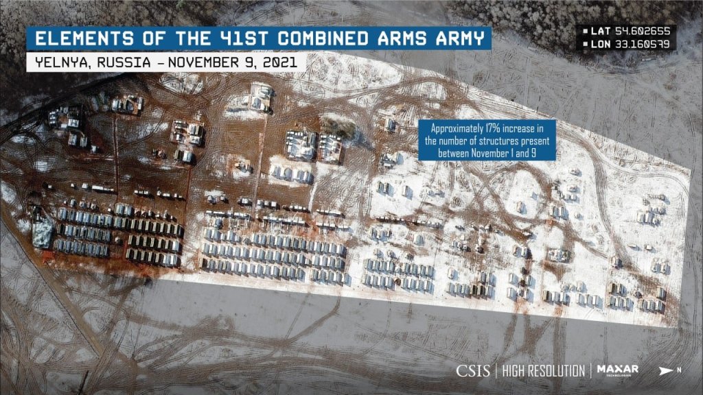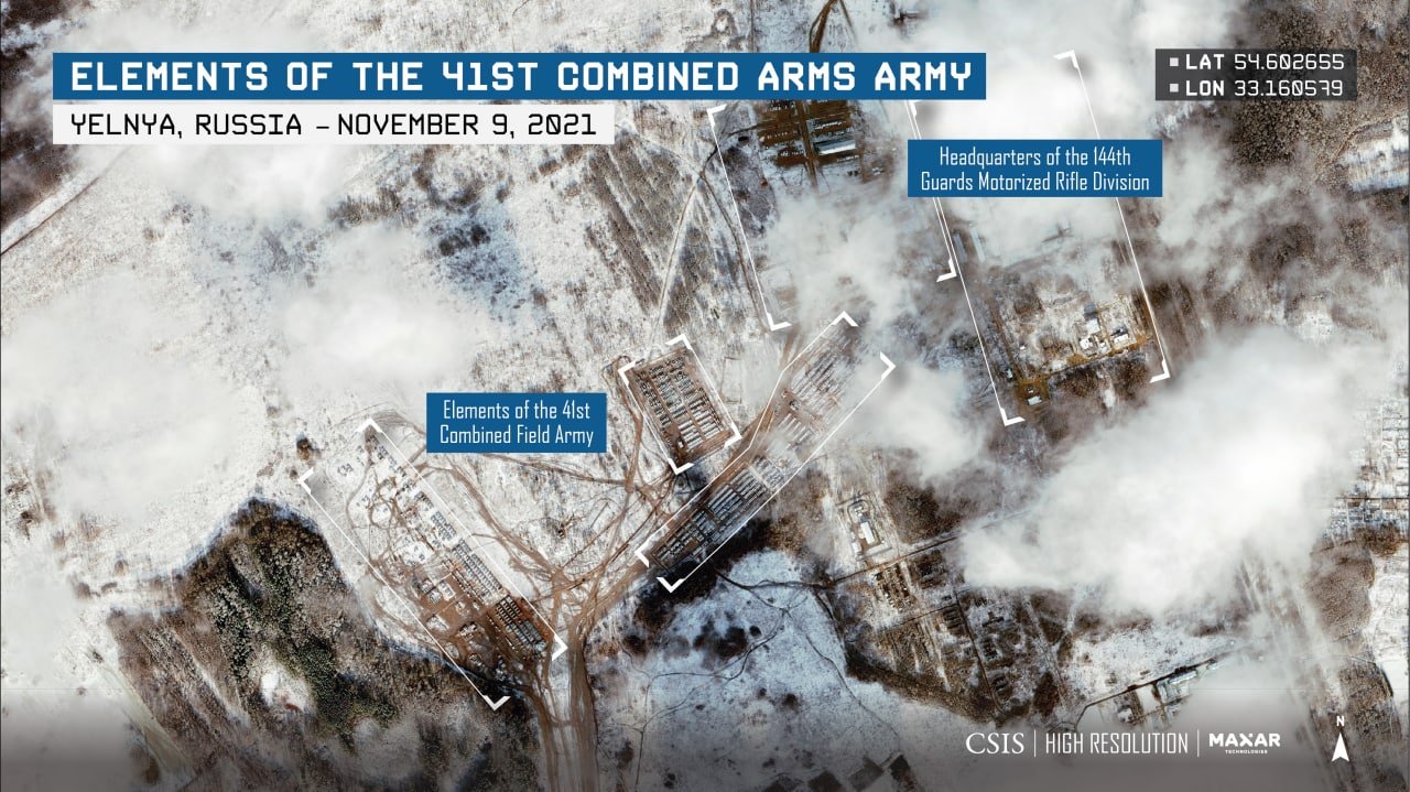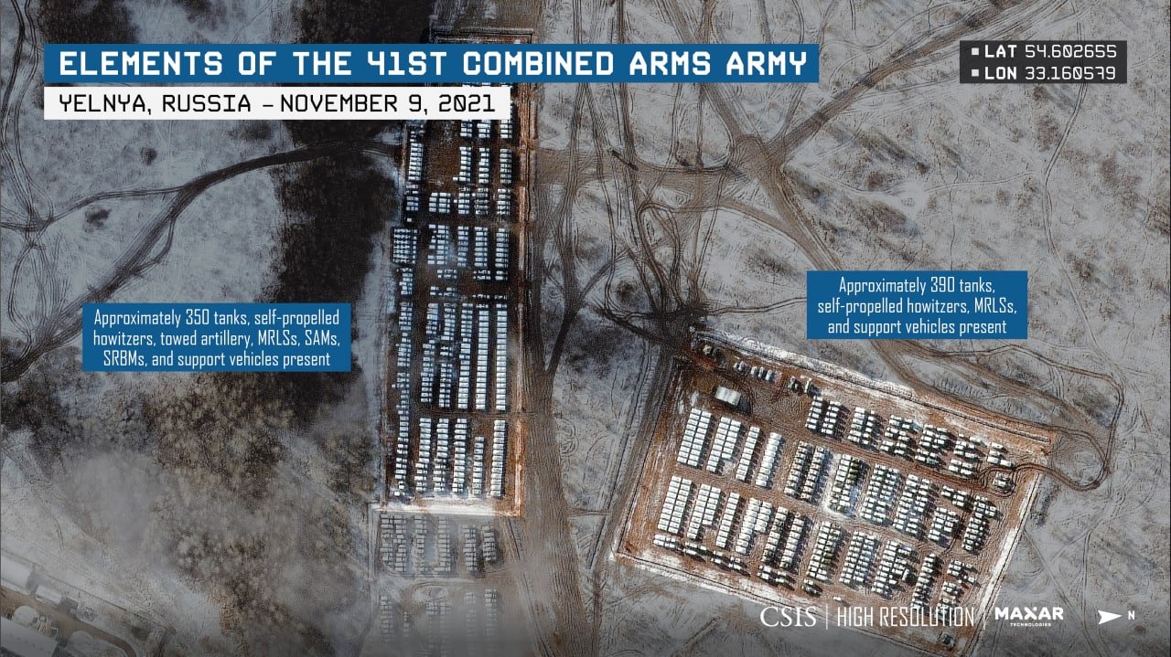 New infographic from the American research center CSIS about the military field camp near Yelnya (Smolensk region). Photo from November 9, 2021. If you enlarge the images, you can see a number of offensive weapons and systems – T-80U tanks, 2S1 Gvozdika and 2S19 Msta self-propelled howitzers, infantry fighting vehicles, BM-21 multiple launch rocket systems (MLRS), heavy flamethrowers TOS-1, short-range ballistic missile systems 9K720 “Iskander” (BRBM). ), towed artillery, anti-aircraft missiles (SAM) and technical support vehicles.)
