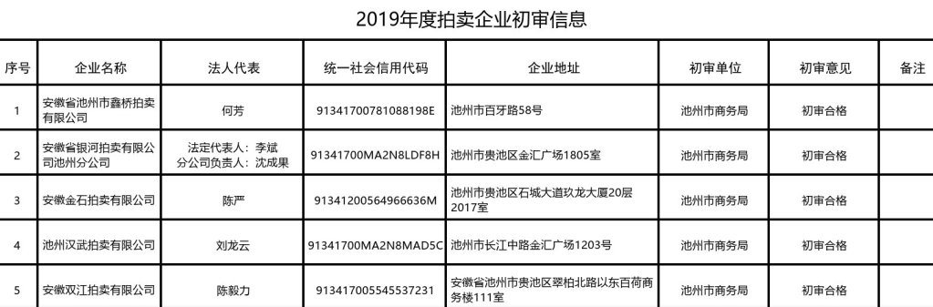 2 安徽省银河拍卖有限公司池州分公司 “法定代表人:李斌 分公司负责人:沈成果” 91341700MA2N8LDF8H 池州市贵池区金汇广场1805室 池州市商务局 初审合格