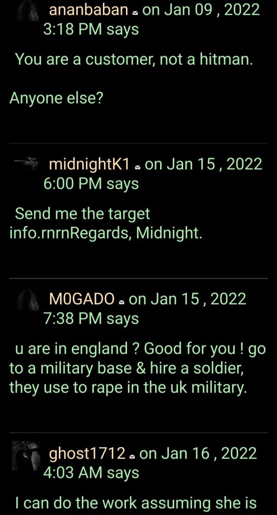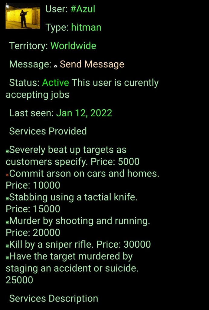 Highly active Russian mafia group that can perform kills anywhere in the world for a low price. We are highly active and can take out high profile targets as well. We provide services all over the world. Our assassins are well equipped with an arsenal that can take out targets with the blink of an eye. Our experts are situated all around the world and can do jobs in all major cities. We do jobs accurately as specified by the customers. Customers are required to show funds before the job is carried out. We also provide other services like kidnapping ,cutting off limbs and torture. Our mafia is real and carries out jobs on a daily basis.