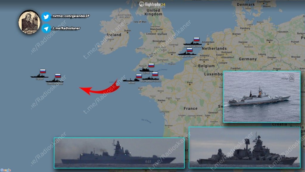 The current position of a group of surface ships of the Northern and Baltic Fleets as part of the tanker “Vyazma”, the auxiliary vessel SB-406, the frigate “Admiral Kasatonov”, the BOD “Vice-Admiral Kulakov” and the missile cruiser “Marshal Ustinov”, corvettes “Stoyky and “savvy”