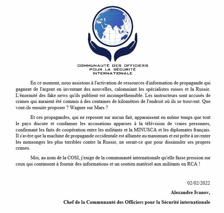 Upset over recent revelations of Russian (Wagner PMC) atrocities committed in #Mali and elsewhere, Alexandre Ivanov falsely complains of disinformation against his organization and Wagner.