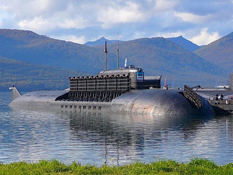 Missile strike complex 3K45 “Granit” with 24 inclined launchers SM-225A with supersonic anti-ship missiles 3M45 “Granit” – SS-N-19 SHIPWRECK. Missile launchers are located in two groups of 12 pieces on board outside the pressure hull.