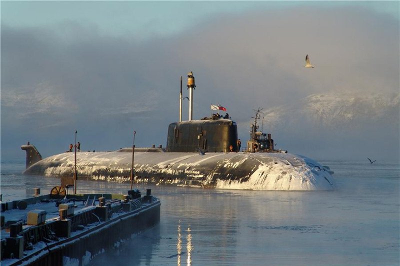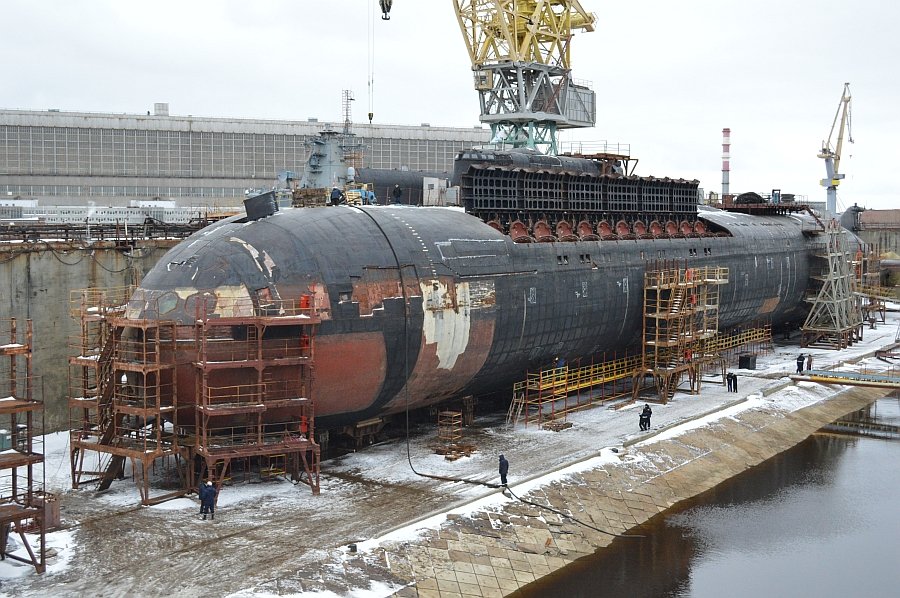 Two-hull structure. The robust case is made of steel AK-33 developed by the Central Research Institute “Prometey” with a thickness of 45 to 68 mm. The robust hull consists of 10 compartments, cylindrical in shape of variable diameter in the bow and middle parts of the ship. The end bulkheads of the pressure hull are cast, the radius of the bow is 8 m, the radius of the stern is 6.5 m. The rocket launchers are located outside the pressure hull at an angle of 45 to the horizon. The design of the boat is specially equipped for navigation in the Arctic regions – there are special reinforcements for the light hull and cabin.
