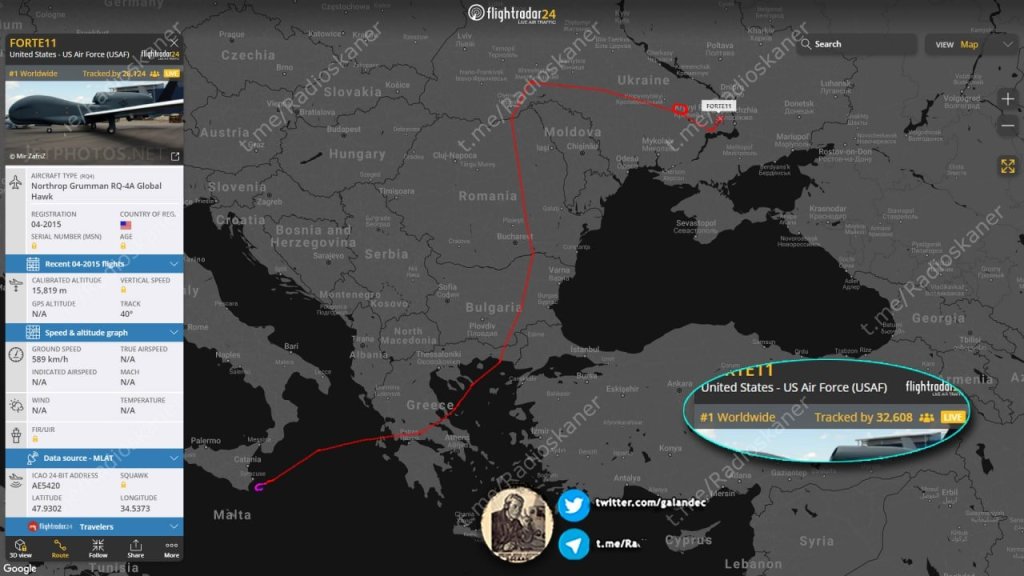 The Northrop Grumman RQ-4 Global Hawk strategic reconnaissance unmanned aerial vehicle of the US Air Force, board 04-2015, which took off from the Sigonella airbase, begins a reconnaissance flight in the airspace of Ukraine.