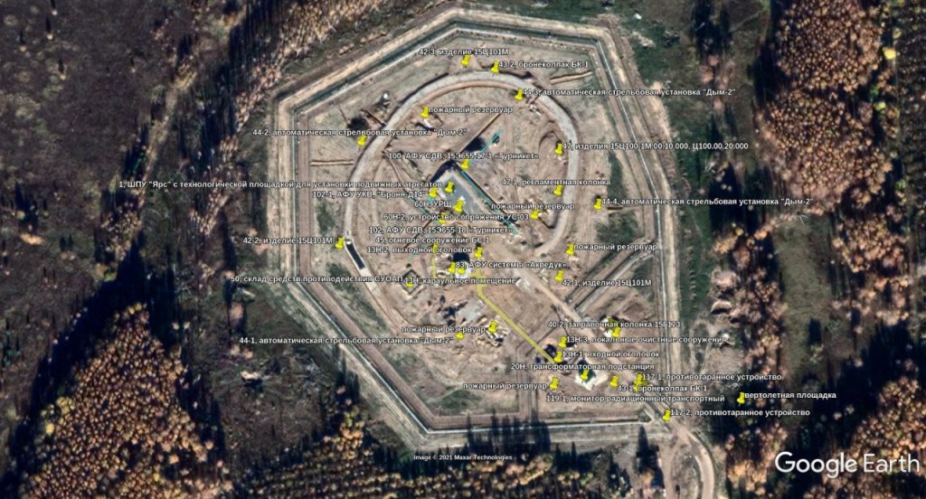 In general, the location of objects on the modern BSP looks like this. For example, a KML file with objects of one of the positions of the OS “Yars” of the 168th missile regiment with an updated complex of protection against the WTO.