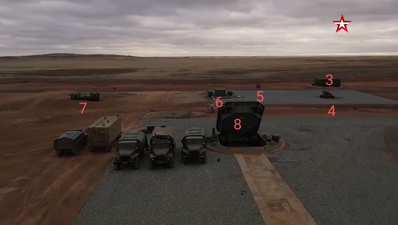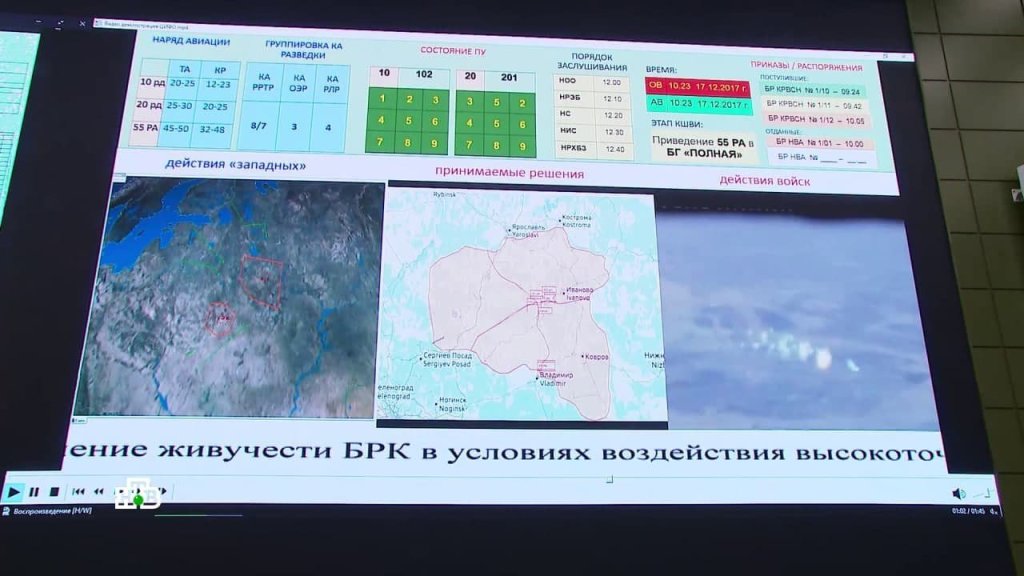 Screenshot from the report of the NTV television company about the training process at the Military Academy of the Strategic Missile Forces named after Peter the Great. In the lower right corner of the information screen, the action of the Blockade CSZ (a set of protective equipment) is demonstrated, the setting of an aerosol interference cloud over the Yars BSP is visible.