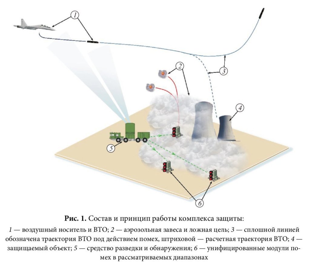 It should be clarified that despite the fact that in some sources the 15Ts62 complex is attributed as an “active defense complex”, 15Ts62 is not a classic KAZ with a kinetic defeat of attacking ammunition, but refers to the means of creating interference. The principle of operation of 15Ts62 can be illustrated with a figure from the article “Method of jamming for the protection of stationary or slow-moving objects”, K.V. Vlasov, 2016, Moscow, MSTU. N.E. Bauman (DOI: 10.18698/0236-3933-2017-4-79-87).