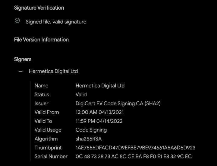 This virus carries a stolen official software signature of Hermetica Digital Ltd and uses an EaseUS product driver to facilitate data corruption.