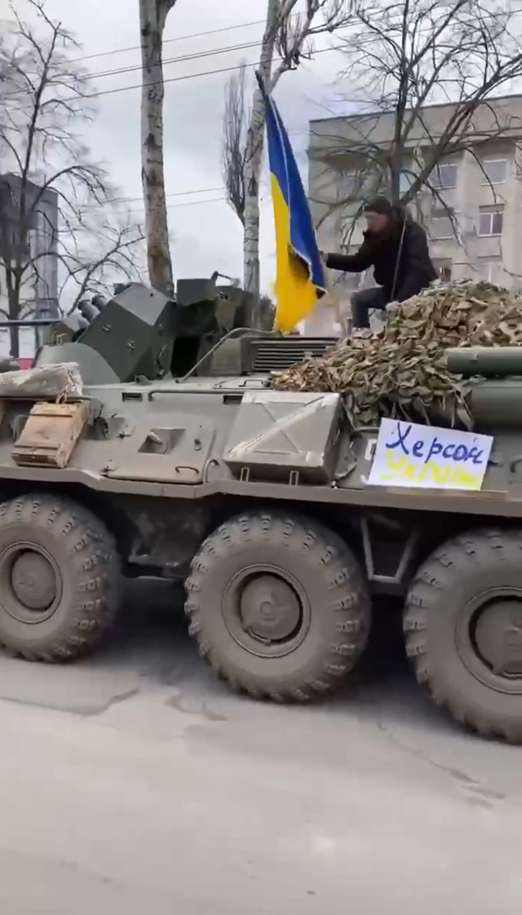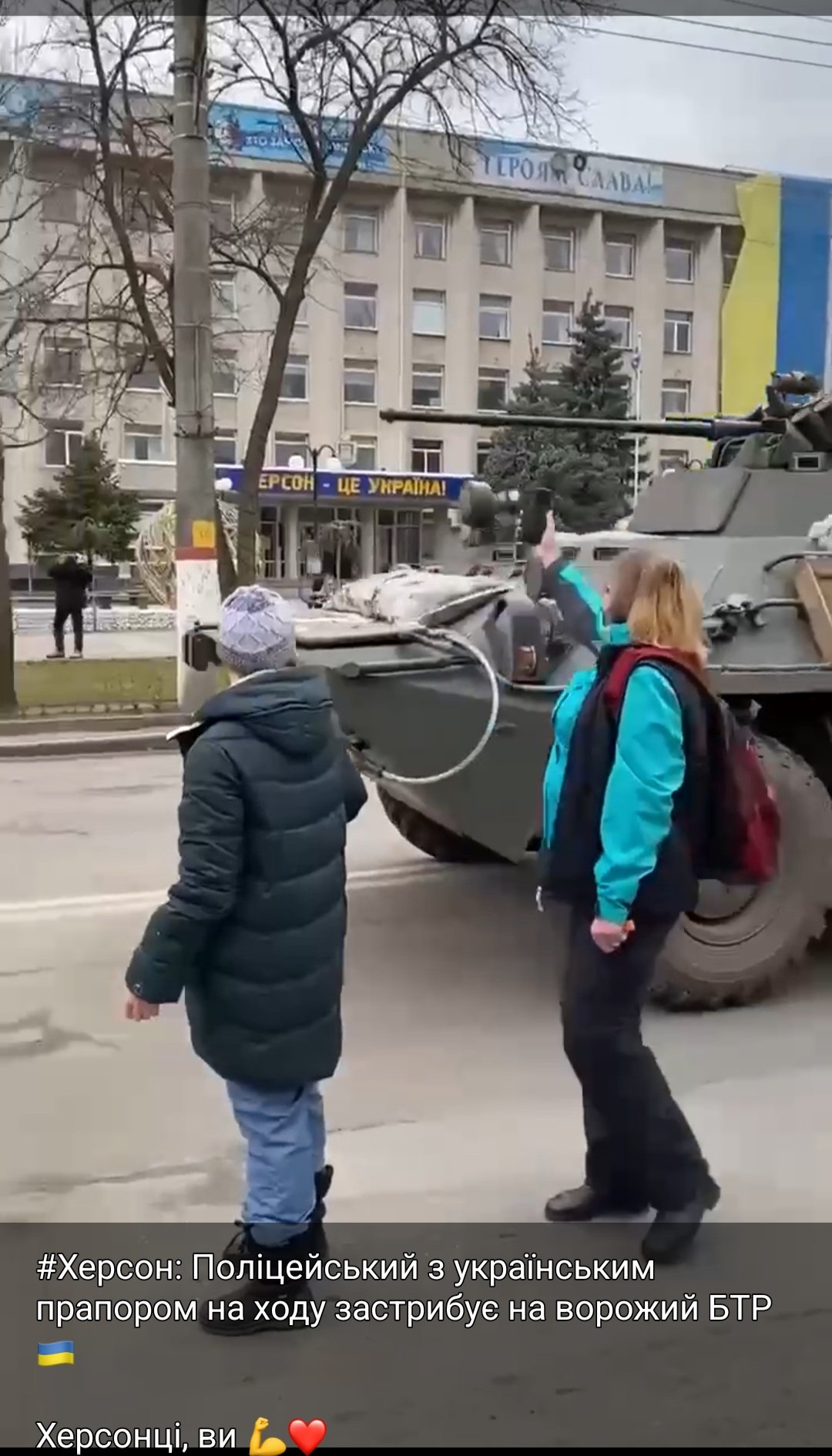 #Kherson: A policeman with a Ukrainian flag on the move jumps on an enemy armored personnel carrier