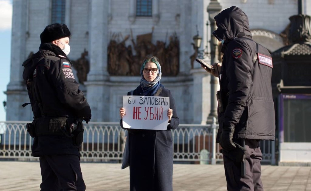 In Moscow, near the Cathedral of Christ the Savior, the police detained a girl with a poster: “The 6th commandment. Thou shalt not kill.”