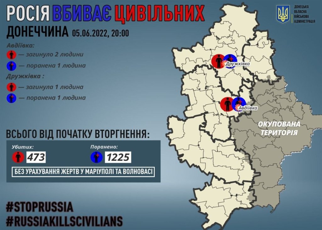 On June 5, orcs killed 3 civilians in Donetsk: 2 in Avdiivka and 1 in Druzhkivka. 2 more people were injured.