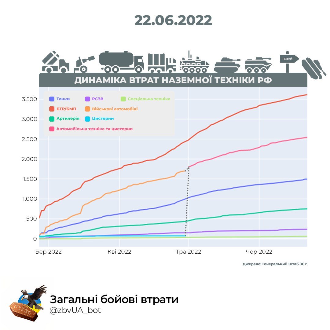 – 0.1% | daily percentage of destruction of the total armed forces of the Russian Federation (13758 units)