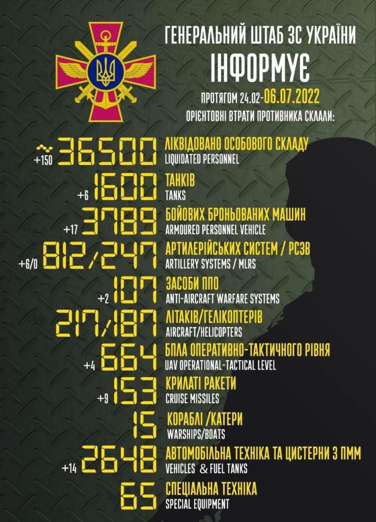 – 0.07% | daily percentage of destruction from the total composition of the armed forces of the Russian Federation (900,000 units)