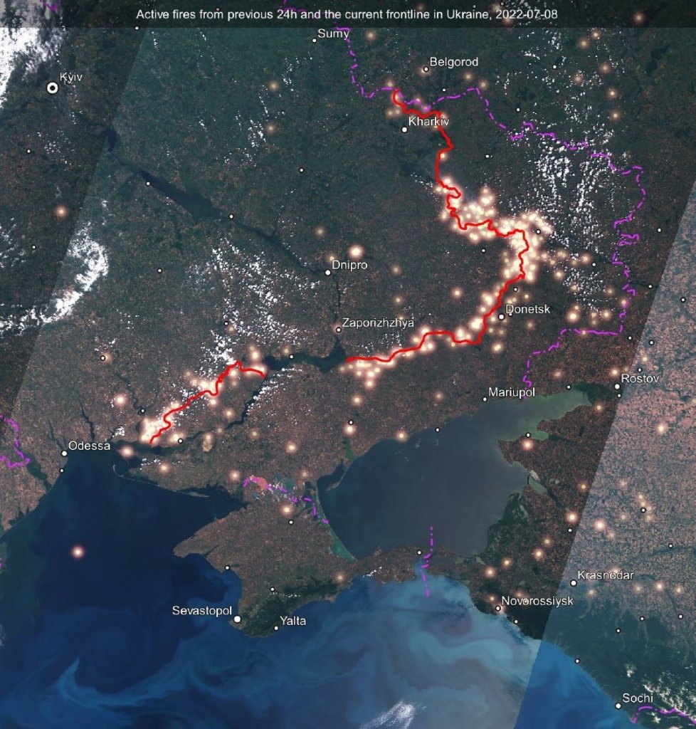 Satellite image (07/08/22) of the front line in the Donbas with a length of over 1000 km. According to Western estimates, the Russian army is firing barrel artillery at the positions of the Armed Forces of Ukraine, firing from 50,000 to 75,000 rounds of ammunition per day.
