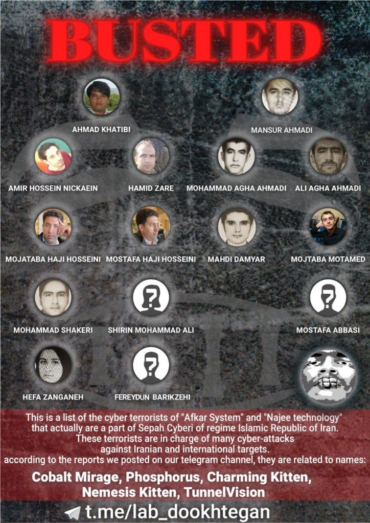 Lab Dookhtegan revealed the identity of several employees of the Cyber Corps and the Intelligence Organization of the Islamic Republic of Iran’s Revolutionary Guards and identified these people as employees of two companies, “Naji Technology” and “Afkar System”, affiliated to the Intelligence Organization of the Islamic Republic.