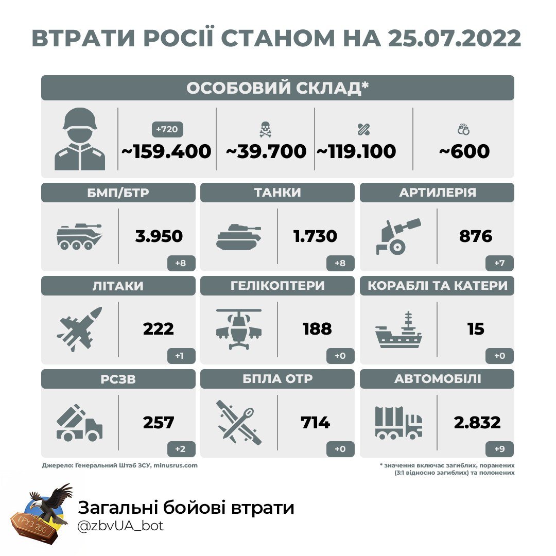 Percentage characteristics of Russia’s losses (07/26/2022):