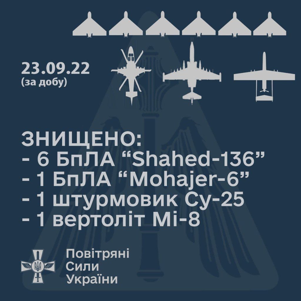 During the day of September 23, anti-aircraft missile units of the Air Force of the Armed Forces of Ukraine destroyed 9 aerial targets.