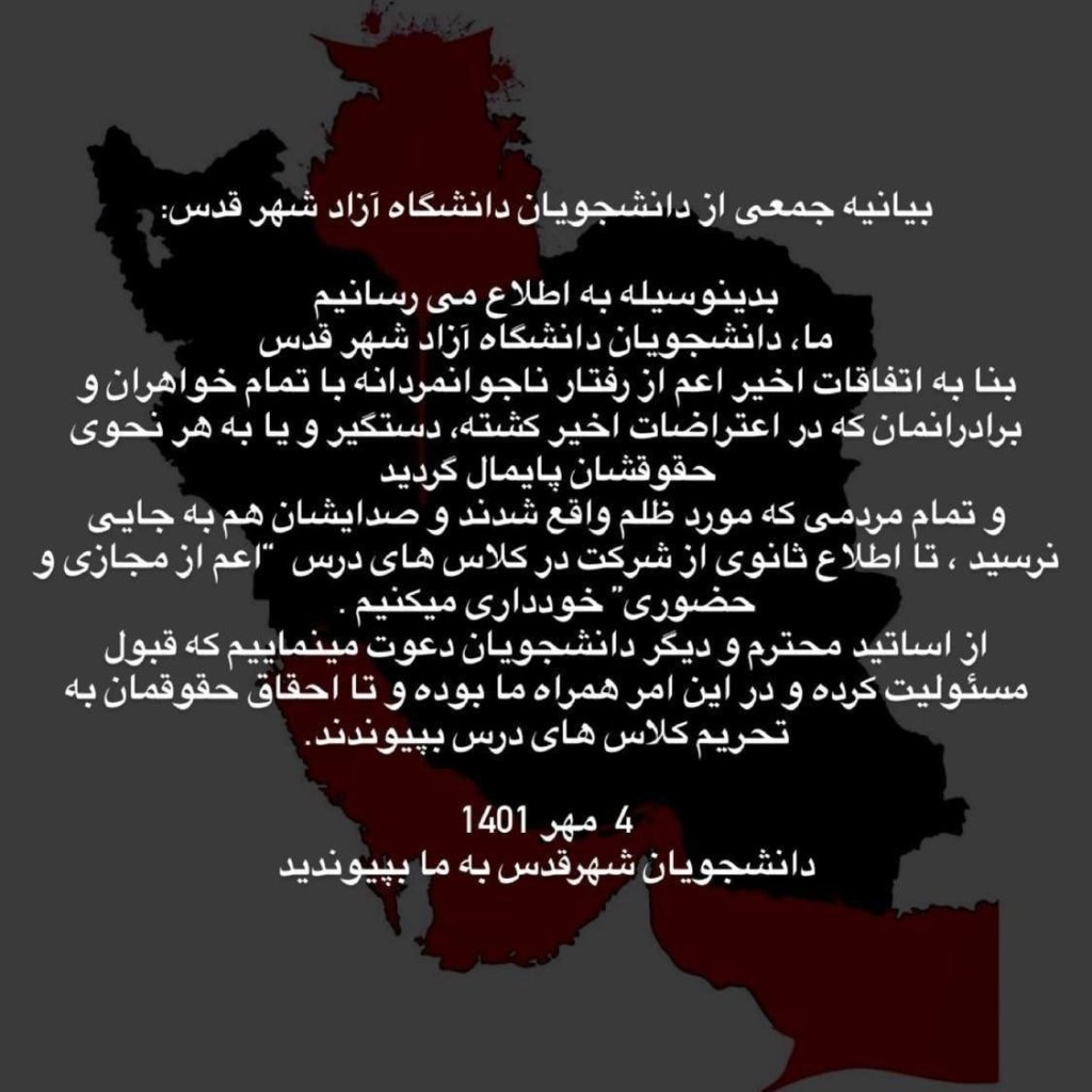 Collective statement of the students of Azad University of Quds to strike and not attend classes in protest against illegal arrests and suppression of demonstrations and rude behavior towards our brothers and sisters.