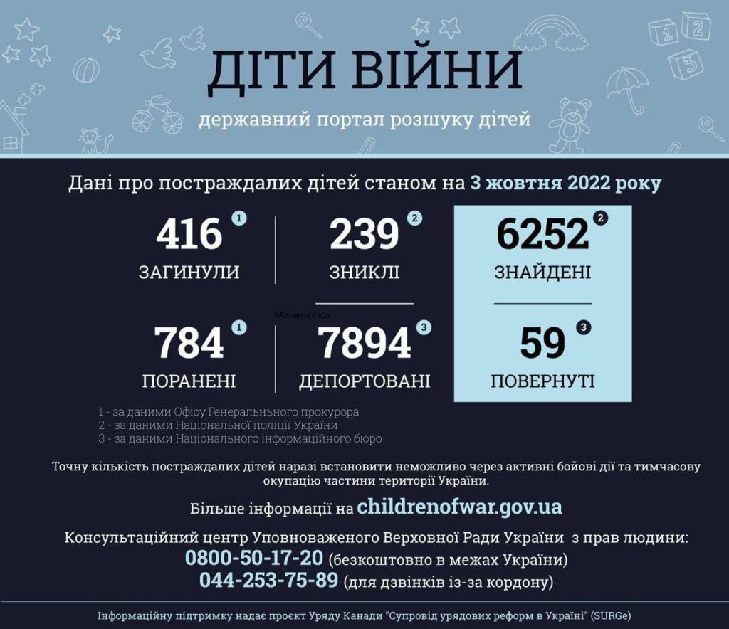 As of the morning of October 3, 2022, more than 1,200 children were injured in Ukraine as a result of the full-scale armed aggression of the Russian Federation. According to the official information of juvenile prosecutors, 416 children died and more than 784 were injured of various degrees of severity.