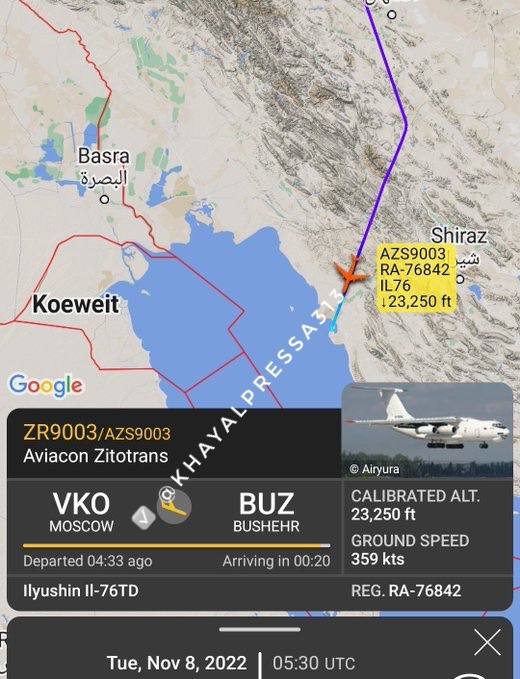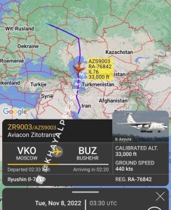 Aviakon Zitotrans” Ilyushin Il-76TD. Flight RA-76842 AZS9003 left Moscow Vnukovo yesterday for Bushehr in Iran, a destination not seen before.