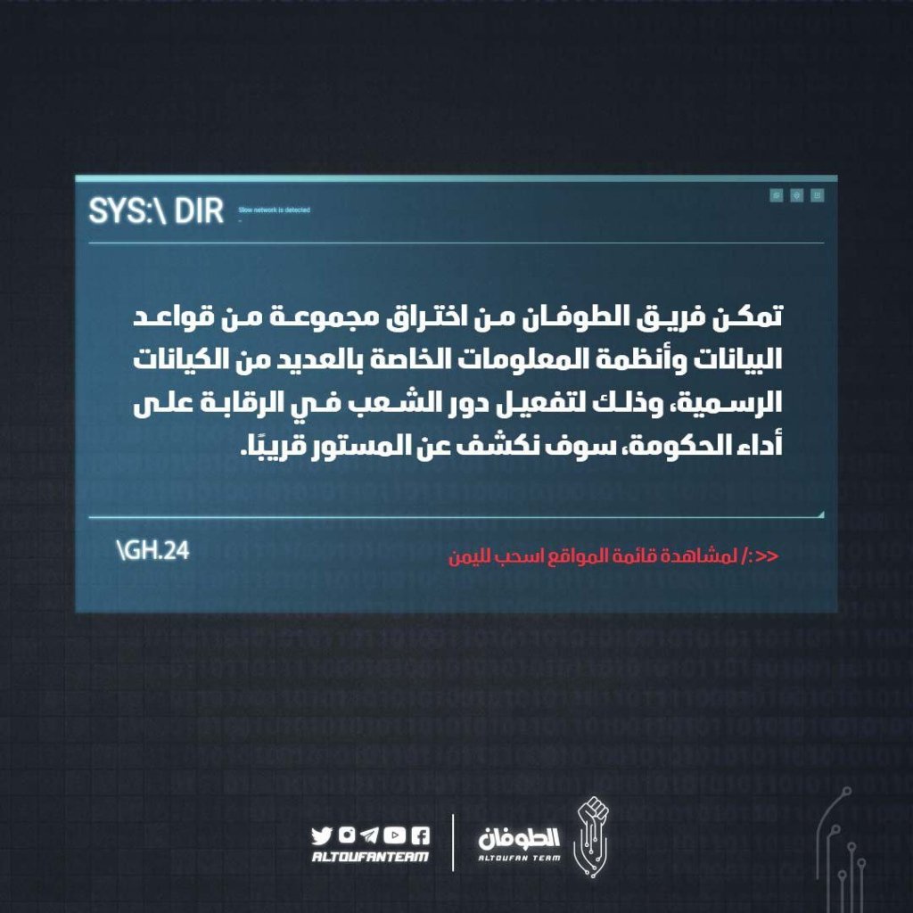 The Flood team managed to penetrate a set of databases and information systems of many official entities, in order to activate the role of the people in monitoring the performance of the government, we will reveal the hidden soon.