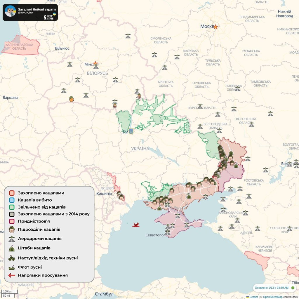 – 0.1% | daily percentage of destruction from the total composition of the armed forces of the Russian Federation (961 units)