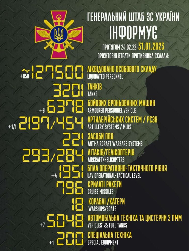 Percentage characteristics of Russia’s losses (31.01.2023):