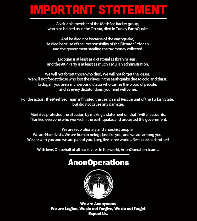 A dear member of the “MeshSec” hacker group who was helping us in “OpIran” died in the earthquake in Turkey.