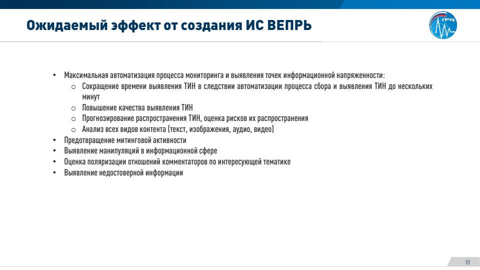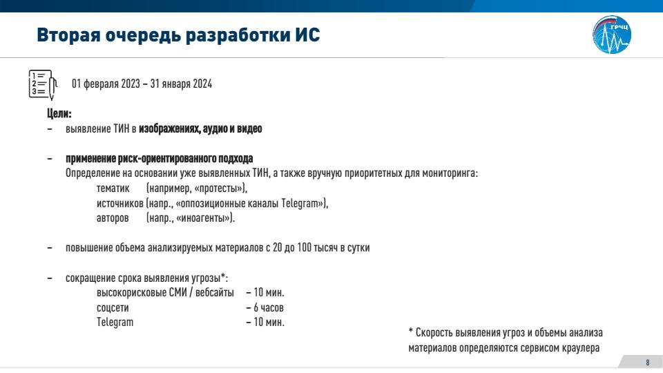 In general terms, its architecture will look like this: a general crawler ( a program that automatically collects information on the Internet. – Ed. ) unloads texts, audio, images and videos from social networks, media and search results, and then these files go to the Unified analysis module ( EMA ). With the help of neural networks, it should, firstly, identify prohibited information, and secondly, forecasts and analytics should be built (which Vepr will do).
