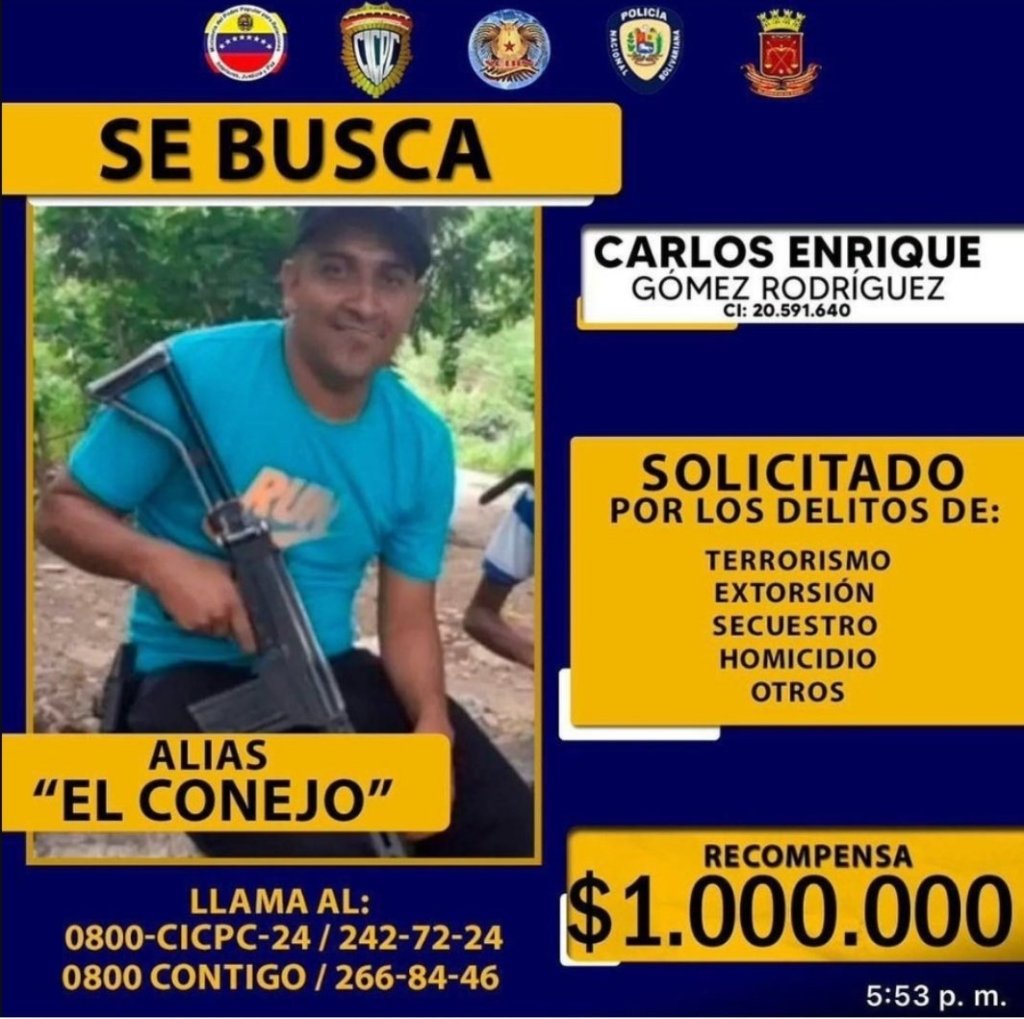 The Venezuelan Scientific, Criminal and Criminal Investigation Corps (Cicpc) announced on Monday a reward of one million dollars to anyone who offers information that allows the whereabouts of Carlos Enrique Gómez Rodríguez, known by the alias “el Conejo”, to be found. leader of a gang of the same name and accused of committing homicides and kidnappings, among other crimes.