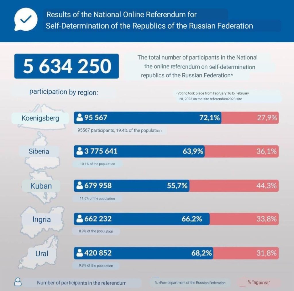 From February 16 to February 28, 2023, initiative groups held referendums on the independence of five regions of Russia: Koenigsberg (Kaliningrad and the region), Ingria (St. Petersburg and the Leningrad region), Kuban, Siberia, and the Urals.