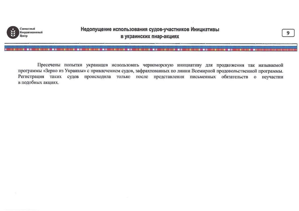 “For the top military and political leadership of the occupying country, a closed final Report “on the work of the Russian part of the joint coordination center during the implementation of the Initiative” was prepared. In general, the text of the document is devoted to the technologies that were used to hinder the implementation of the grain corridor and ultimately led to the final termination of the agreement. According to the Report, the so-called “joint coordination center” saw its main task as the maximum reduction of the volume of grain that was exported within the limits of the Grain Agreement.”