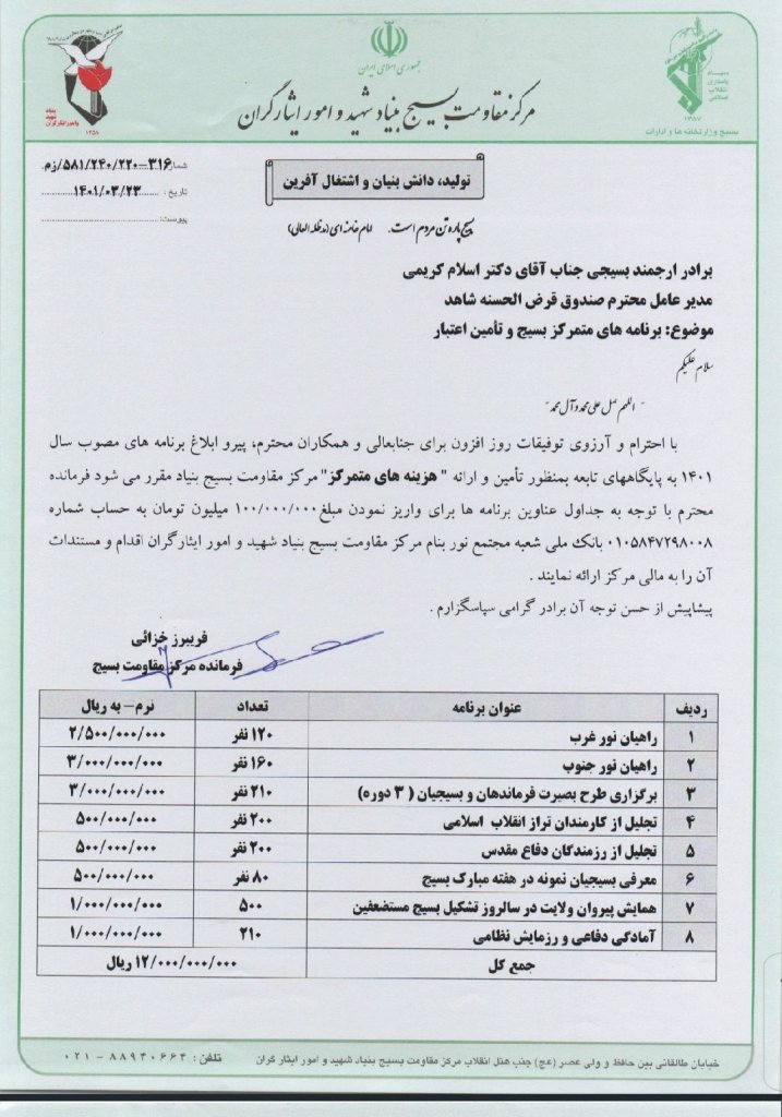 With respect and wishes for more and more success for your Excellency and respected colleagues, following the notification of the programs approved in 1401 to the subordinate bases in order to provide and provide the centralized costs of the Basij Resistance Center of the Foundation.