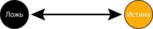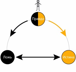 The diagram shows that truth and falsehood are polar, and are the centers of gravity of truth, which is a variable depending on a person’s choice of the vector of self-determination in his pursuit of either truth or falsehood. It is necessary to learn how to consider this process in dialectical dynamics, understanding that the position of a person with his own “truth” can shift both towards one pole and towards the other.