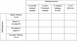 We do not yet consider more complex options, when the observer partially believes and partially does not believe any of the communicants. Thus, we obtain a total principal matrix, which already consists of 16 options.