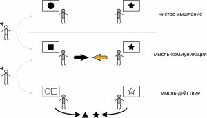 In accordance with the scheme of mental activity of Meerovich-Shchedrovitsky, we need to additionally provide each variant of communication with two strata, namely, the floors of thinking and activity, in accordance with which we have one more sign by which we can distinguish the orientation of the communicant to lie, or truth ( Fig.7). Lies are reflexive inconsistencies or conscious purposeful disagreements between thinking, communication and activity. If a person thinks one thing, says another, and does a third, he is lying. If a person thinks one thing, but says and does another, he is also lying. If a person thinks and says one thing and does another, he lies again. If a person thinks and does one thing, and says another, he is again lying. And only if there is a harmony of coherence between all layers, and a person thinks and speaks, and does the same thing – this is the truth, striving for the truth. “By their fruits you will know them” [Gospel of Matthew, Ch.7].