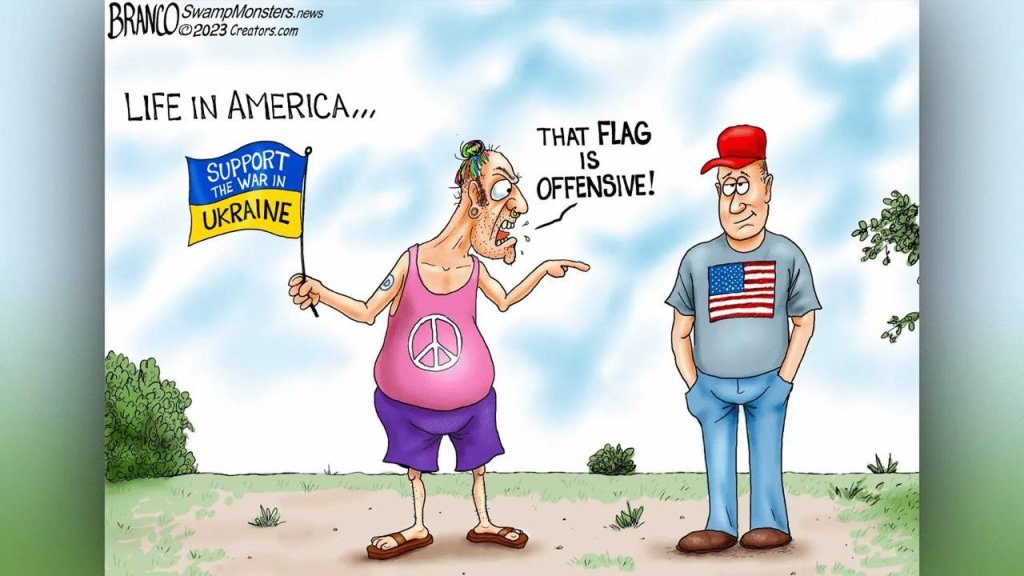 lazy, dirty hippie of unclear orientation, who supports Ukraine, “hates” an ordinary working guy with a star-striped flag on his T-shirt: “This flag offends me.”