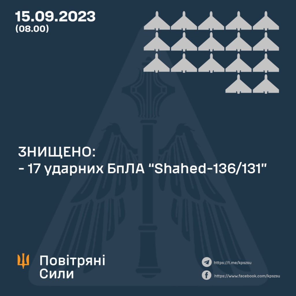 On the night of September 15, 2023, the enemy attacked Ukraine with “Shahed-136/131” type UAVs from the southeast (Prymorsko-Akhtarsk – Russian Federation).