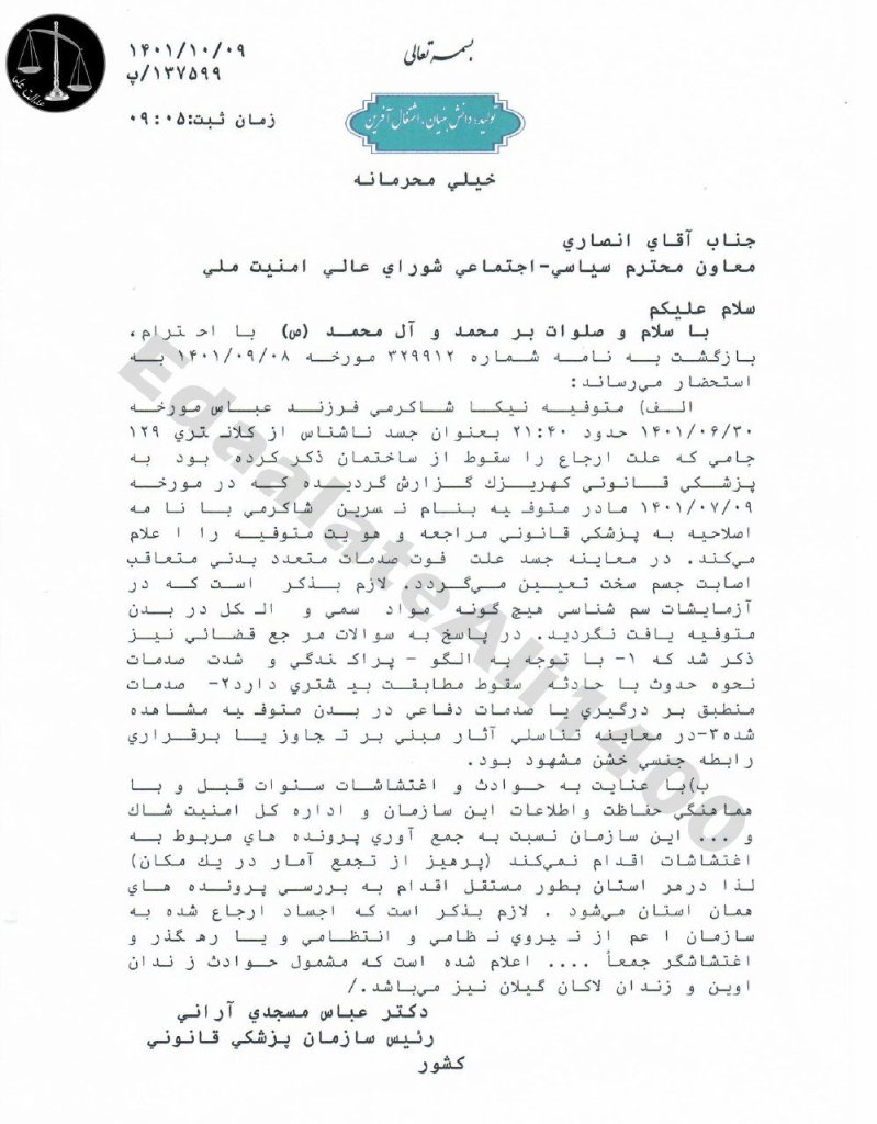 A highly classified letter from Dr. Abbas Masjidi Arani, the head of the Forensic Medicine Organization of the country, to Ansari, the political-social deputy of the Supreme National Security Council.