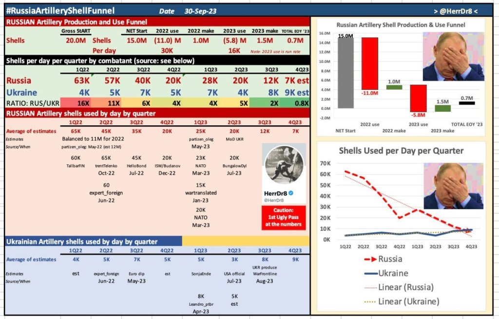 Osinter HerrDr8 calculated the consumption of artillery ammunition by both sides based on public data on pre-war stocks, estimated production, foreign shipments, and public statements by officials.